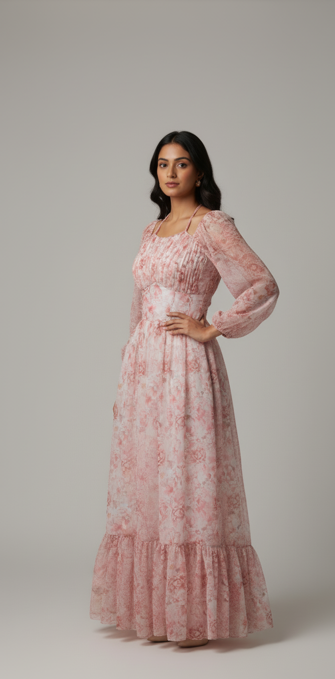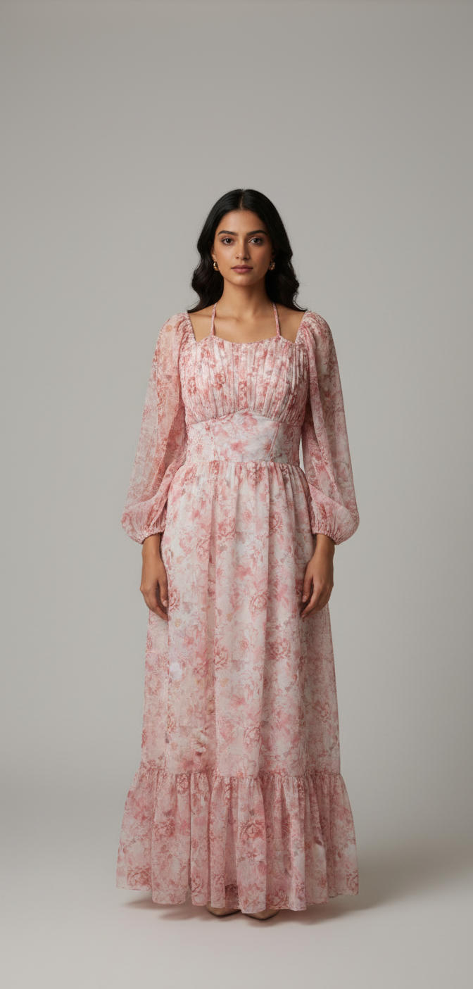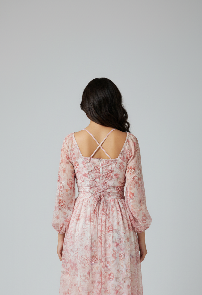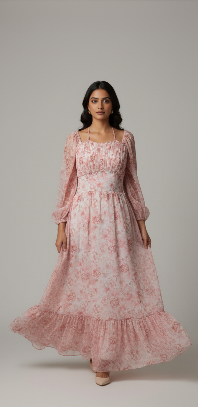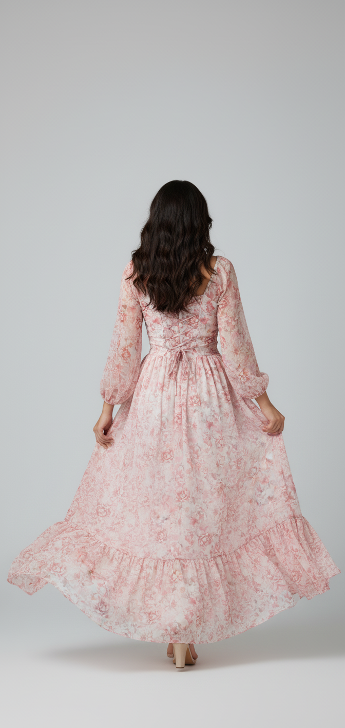 A maxi frock with adjustable off sleeves ,and with zipper at the back and threads to tie for adjusting fit and layers draped front with corset finish give you the cottage core lady vibes in fairy tales✨